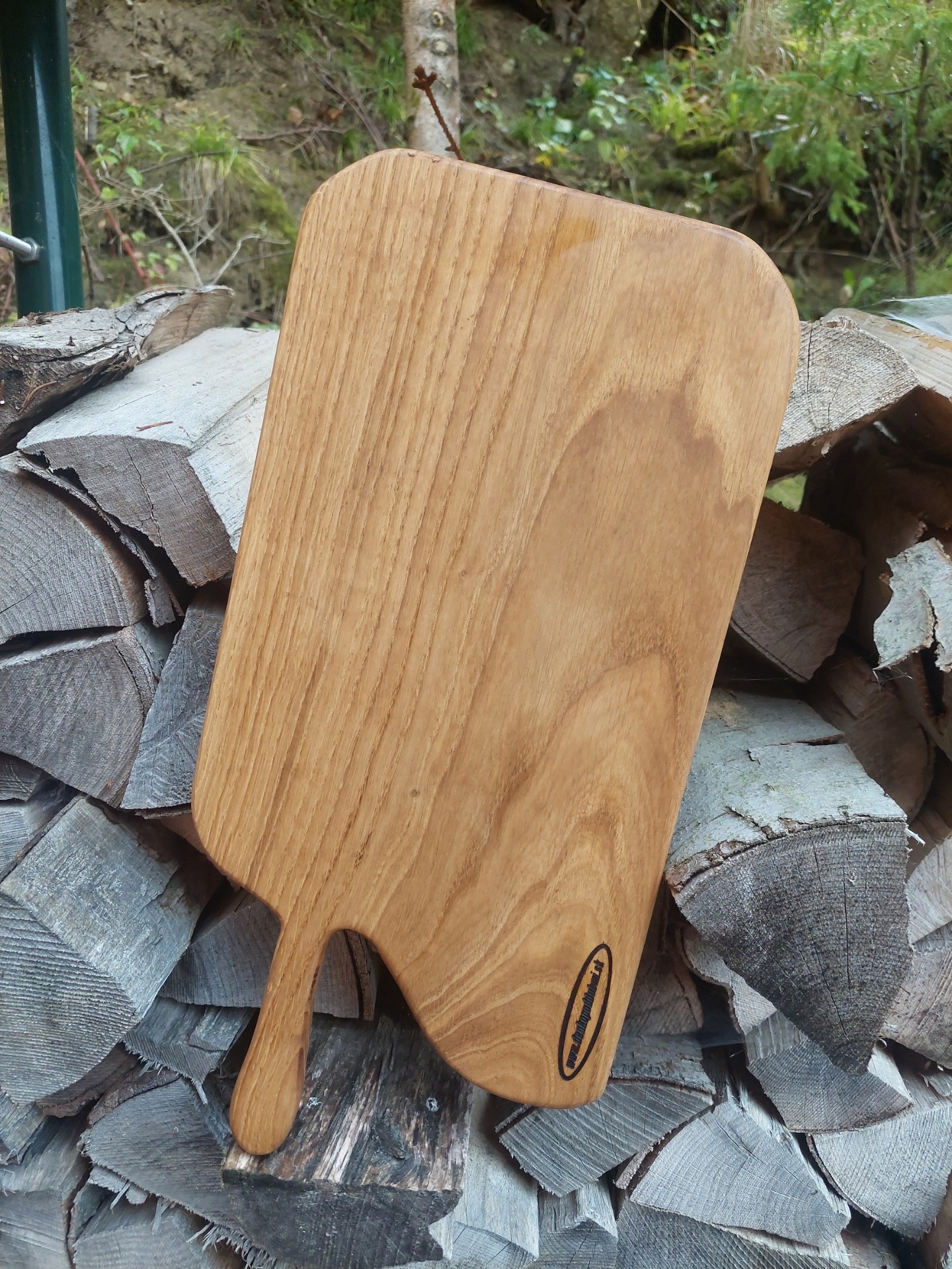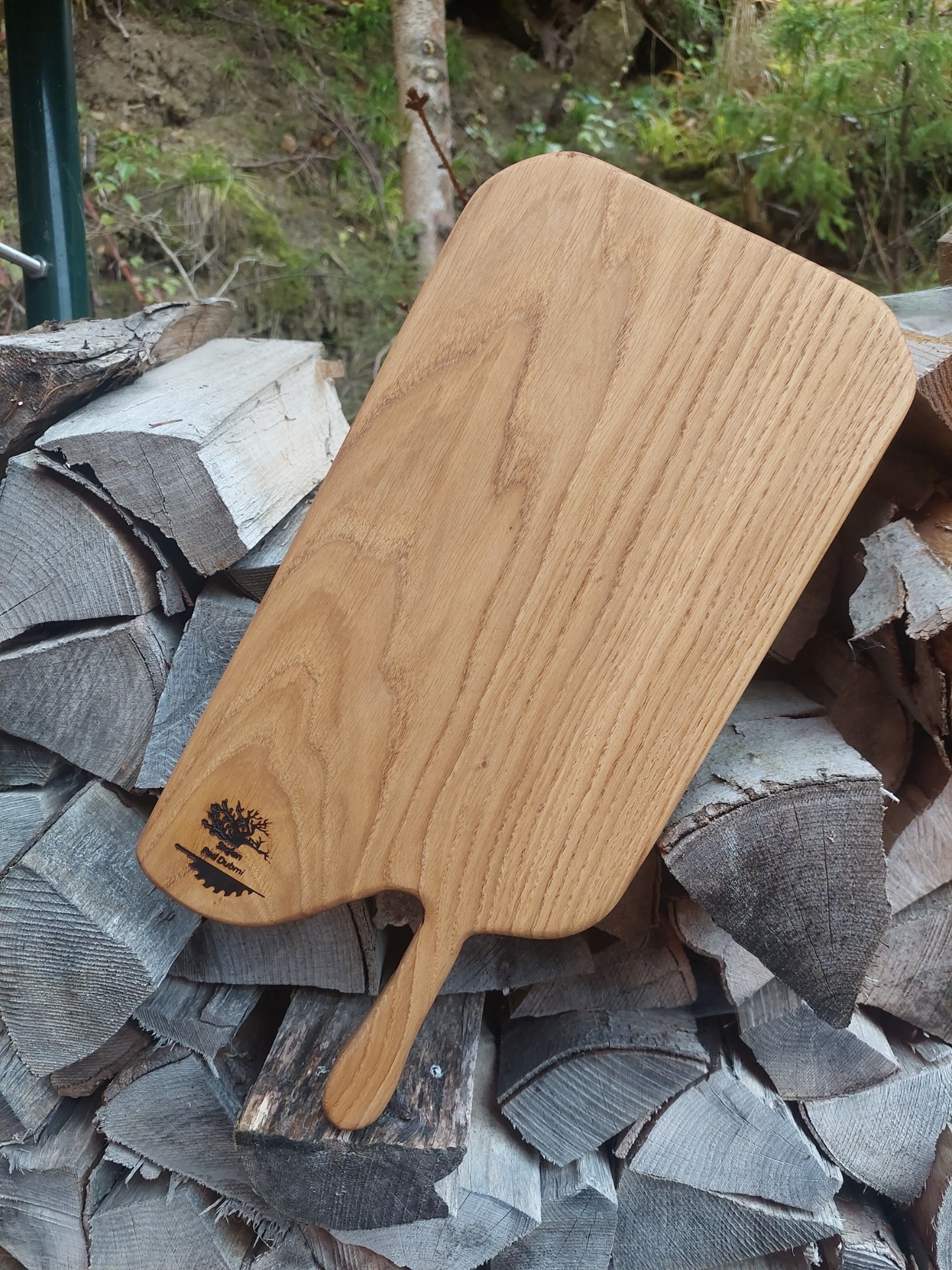 Denko, lopár vyrobené z dubového dreva . Strom mal viac ako 100 rokov , sadil ho manželkin dedko, bohužiaľ bol už chorý tak sme ho museli zrezať , hrozilo zrútenie na rodinný dom. Bolo mi ľúto všetko spáliť v kotly, tak som vyrobil dosky na krájanie, aspoň takto bude ešte niekomu slúžiť. Kazy a trhliny sú zaliate epoxidom. Drevo ošetrené olejom s voskom značky Osmo - bezpečný pri styku s potravinami.