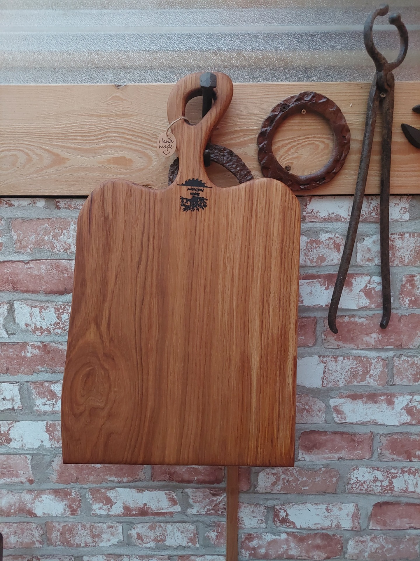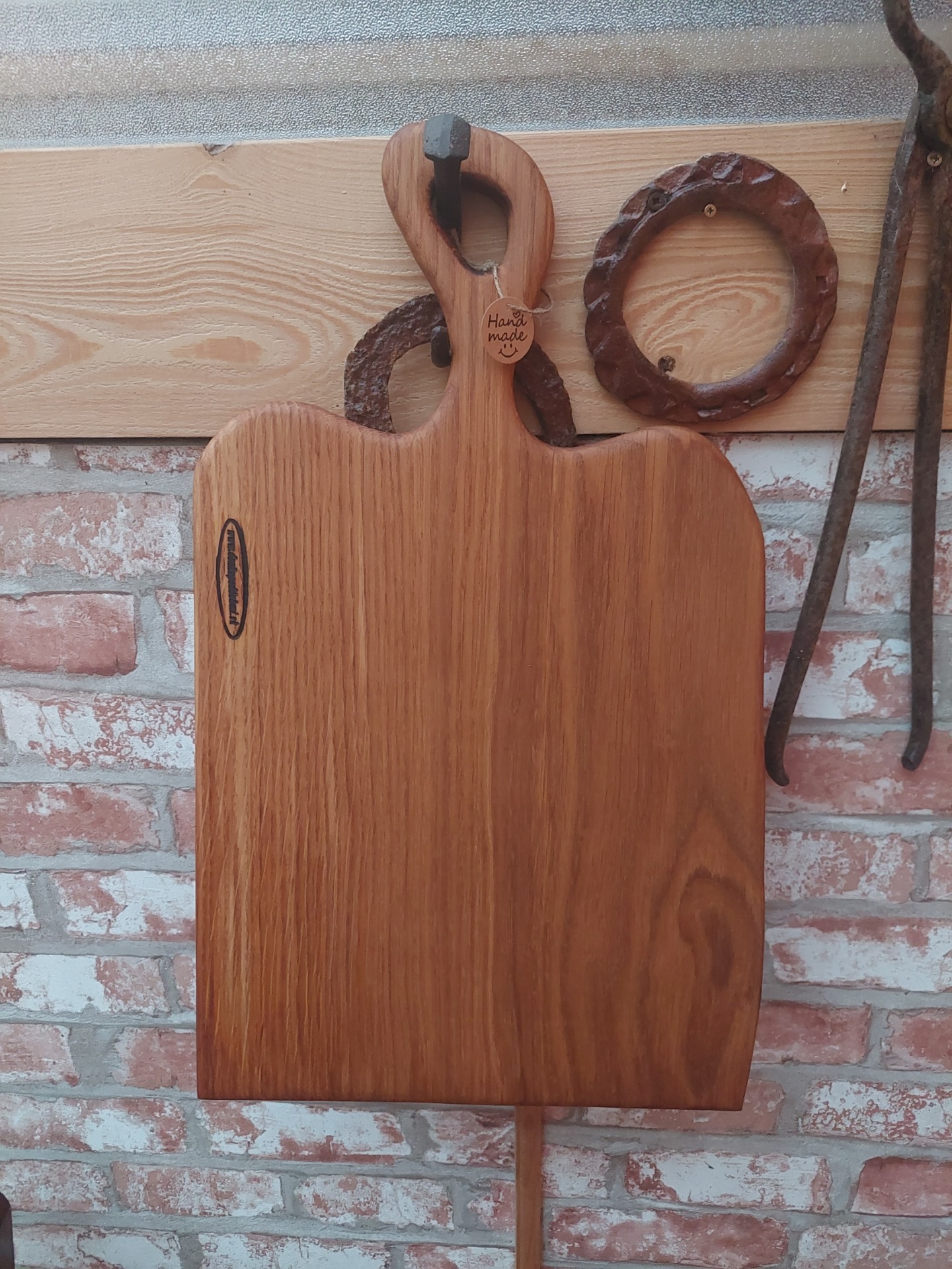 Denko, lopár vyrobené z dubového dreva . Strom mal viac ako 100 rokov , sadil ho manželkin dedko, bohužiaľ bol už chorý tak sme ho museli zrezať , hrozilo zrútenie na rodinný dom. Bolo mi ľúto všetko spáliť v kotly, tak som vyrobil dosky na krájanie, aspoň takto bude ešte niekomu slúžiť. Kazy a trhliny sú zaliate epoxidom. Drevo ošetrené olejom s voskom značky Osmo - bezpečný pri styku s potravinami.