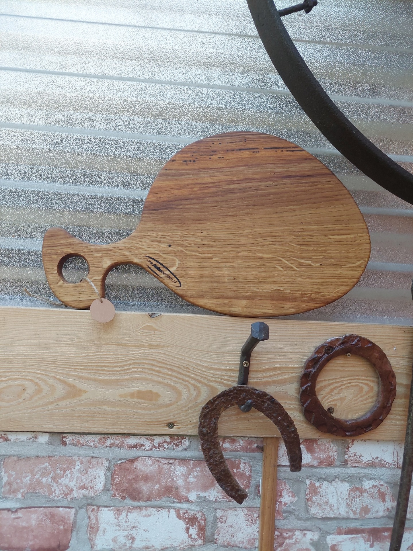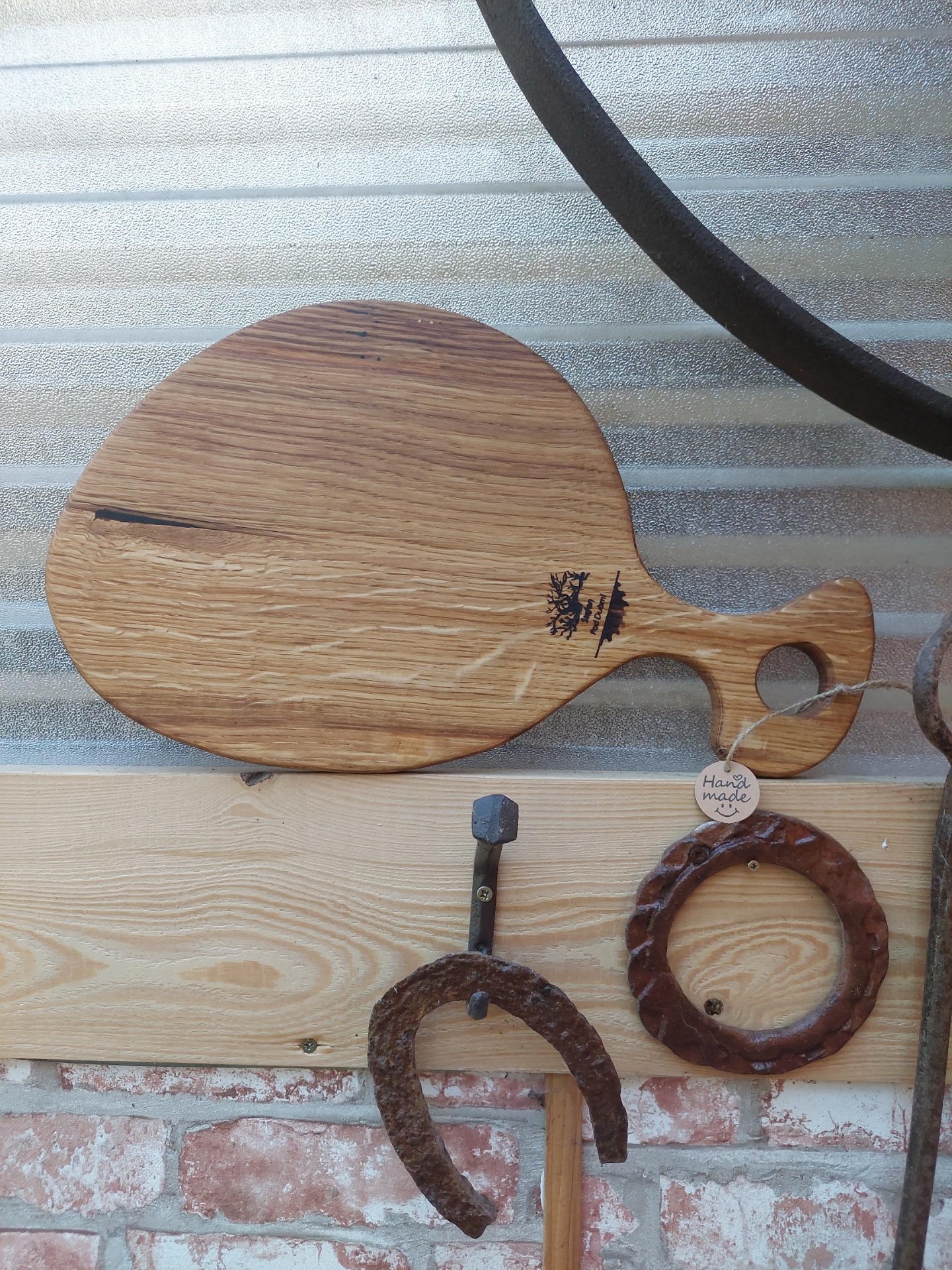 Denko, lopár vyrobené z dubového dreva . Strom mal viac ako 100 rokov , sadil ho manželkin dedko, bohužiaľ bol už chorý tak sme ho museli zrezať , hrozilo zrútenie na rodinný dom. Bolo mi ľúto všetko spáliť v kotly, tak som vyrobil dosky na krájanie, aspoň takto bude ešte niekomu slúžiť. Kazy a trhliny sú zaliate epoxidom. Drevo ošetrené olejom s voskom značky Osmo - bezpečný pri styku s potravinami.