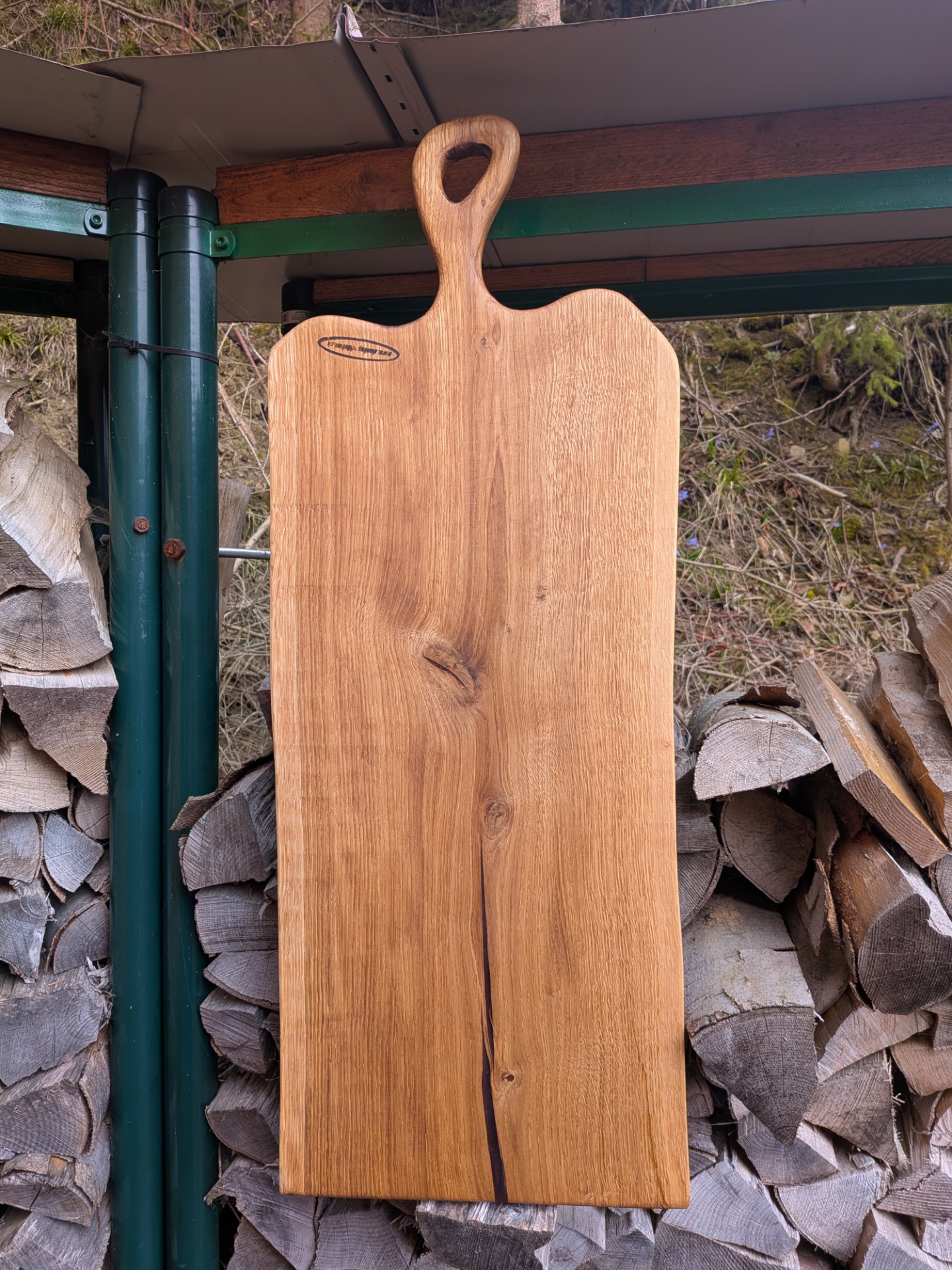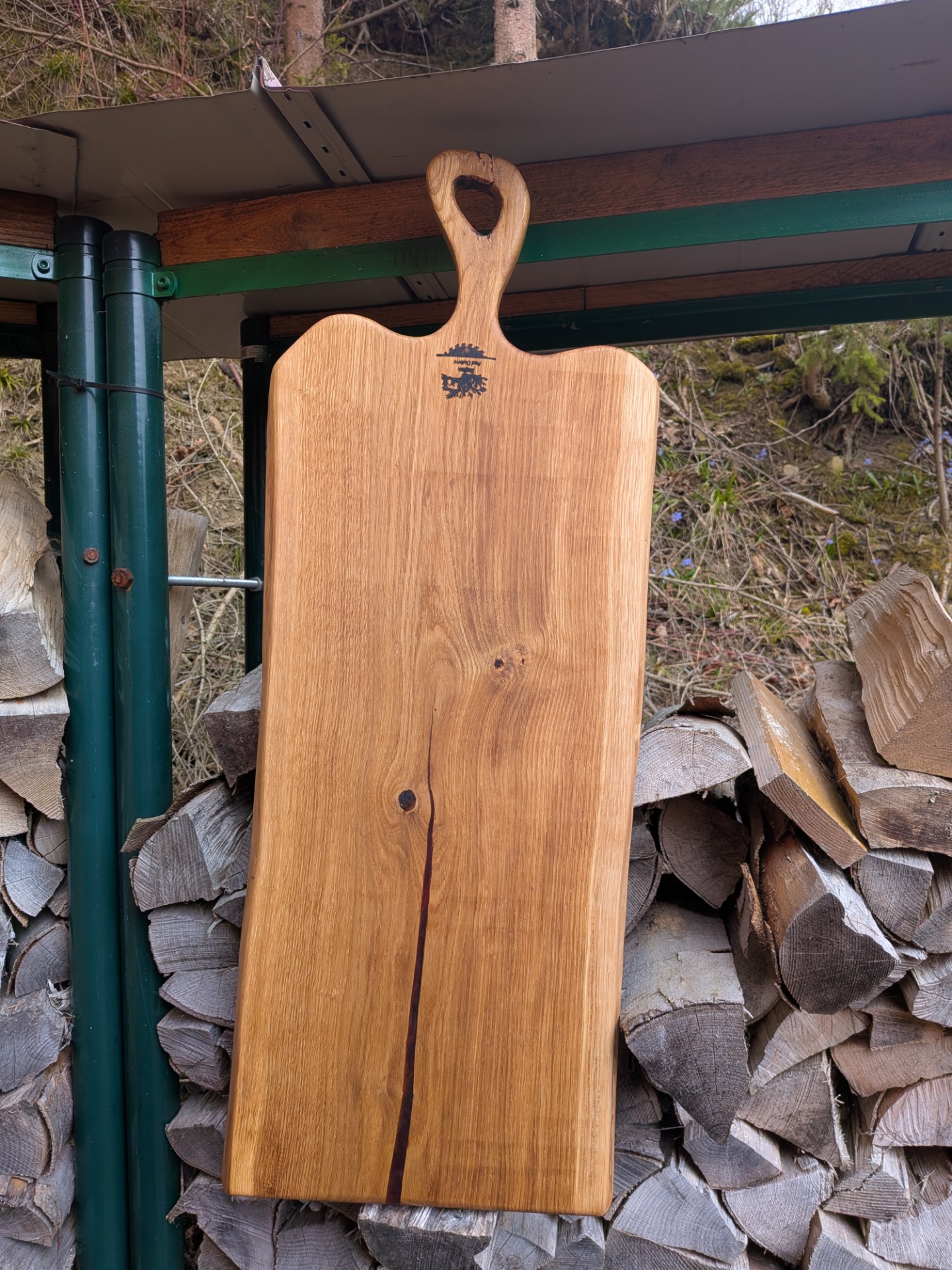 Denko, lopár vyrobené z dubového dreva . Strom mal viac ako 100 rokov , sadil ho manželkin dedko, bohužiaľ bol už chorý tak sme ho museli zrezať , hrozilo zrútenie na rodinný dom. Bolo mi ľúto všetko spáliť v kotly, tak som vyrobil dosky na krájanie, aspoň takto bude ešte niekomu slúžiť. Kazy a trhliny sú zaliate epoxidom. Drevo ošetrené olejom s voskom značky Osmo - bezpečný pri styku s potravinami.