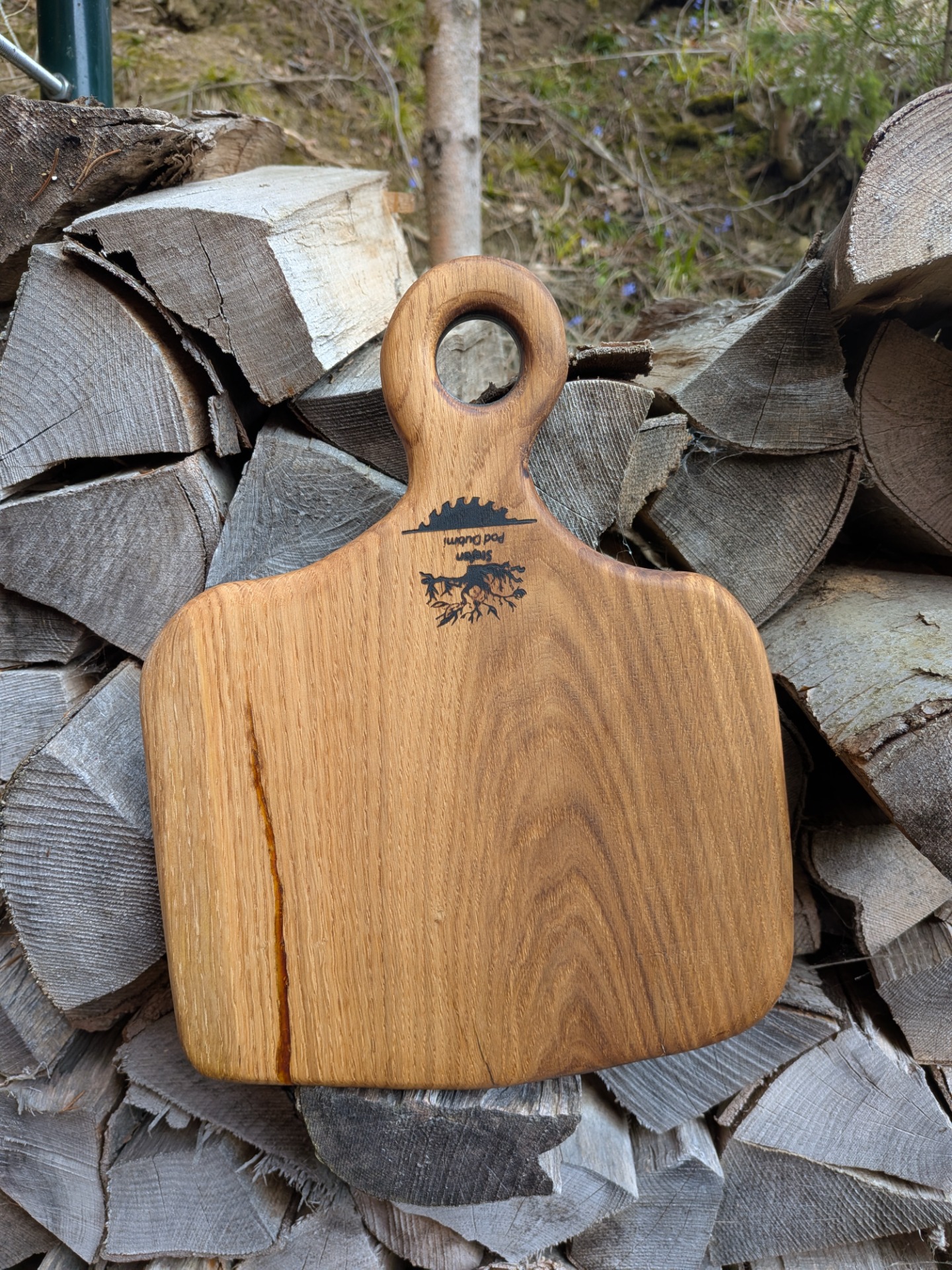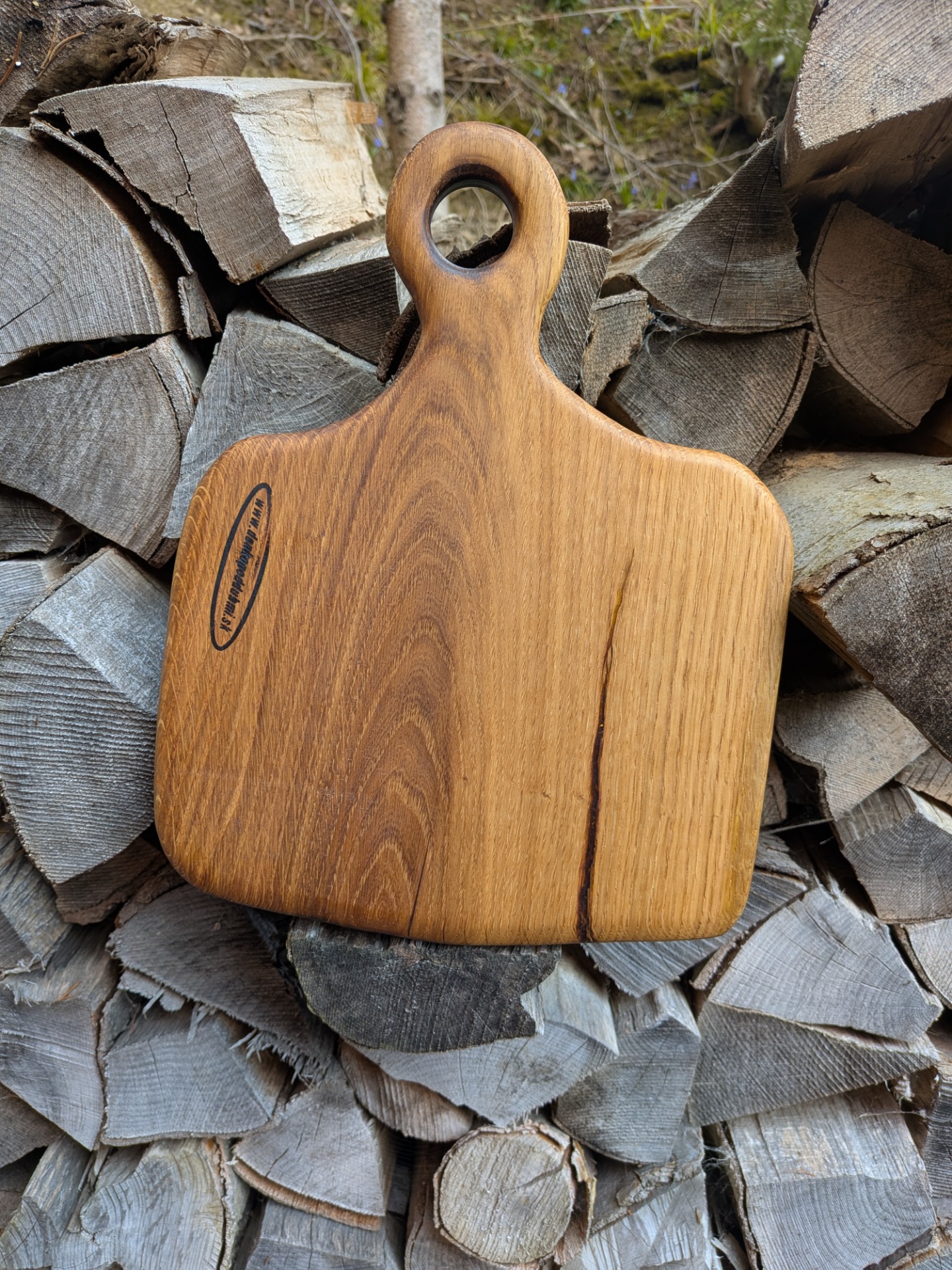 Denko, lopár vyrobené z dubového dreva . Strom mal viac ako 100 rokov , sadil ho manželkin dedko, bohužiaľ bol už chorý tak sme ho museli zrezať , hrozilo zrútenie na rodinný dom. Bolo mi ľúto všetko spáliť v kotly, tak som vyrobil dosky na krájanie, aspoň takto bude ešte niekomu slúžiť. Kazy a trhliny sú zaliate epoxidom. Drevo ošetrené olejom s voskom značky Osmo - bezpečný pri styku s potravinami.