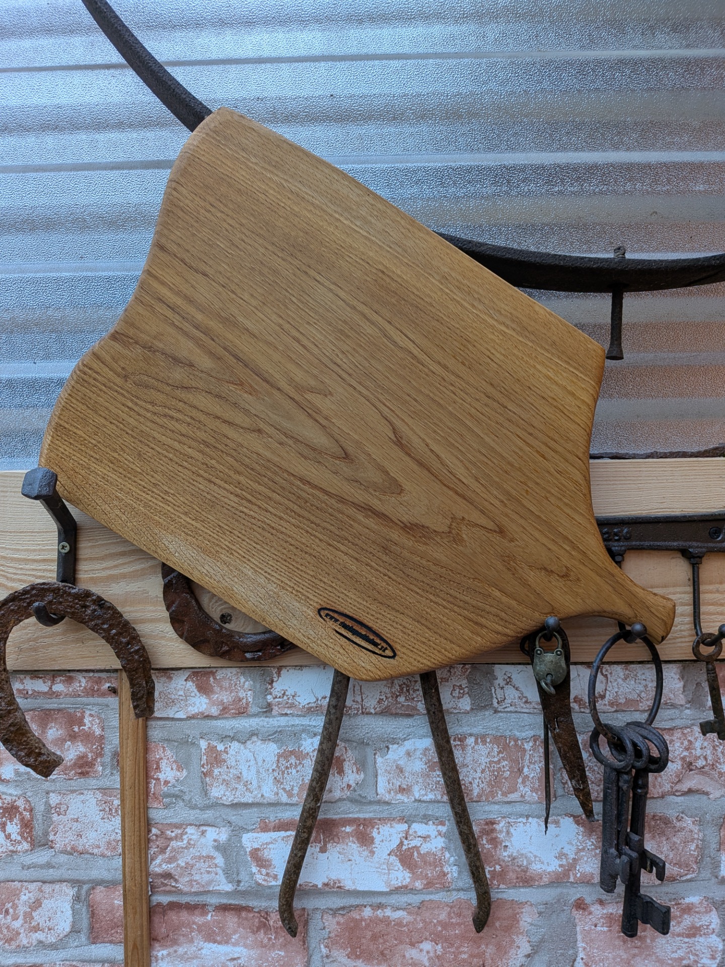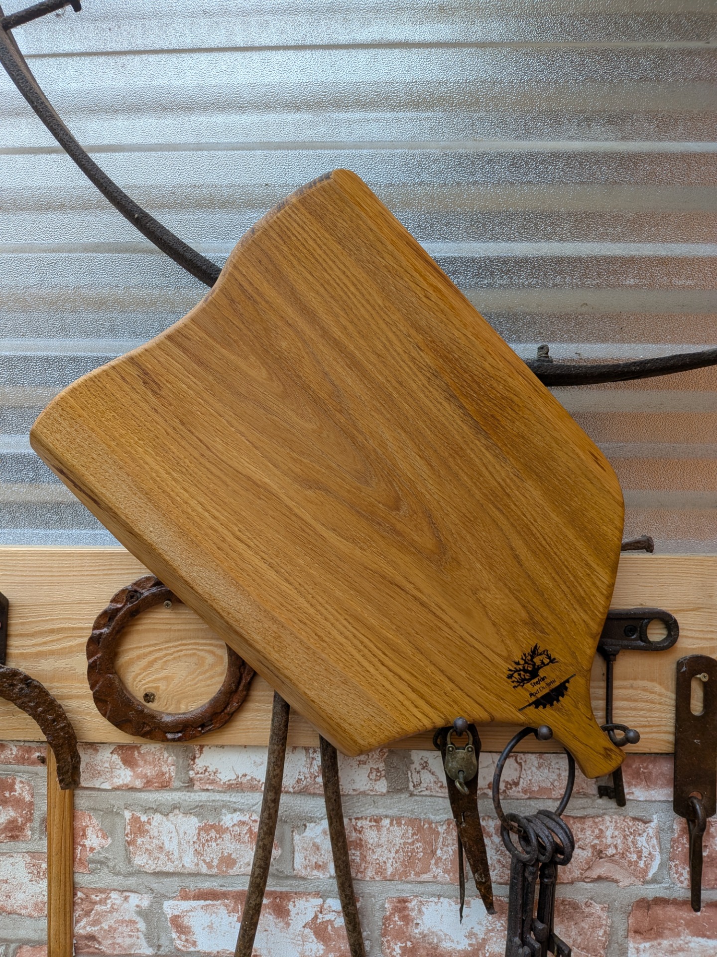 Denko, lopár vyrobené z dubového dreva . Strom mal viac ako 100 rokov , sadil ho manželkin dedko, bohužiaľ bol už chorý tak sme ho museli zrezať , hrozilo zrútenie na rodinný dom. Bolo mi ľúto všetko spáliť v kotly, tak som vyrobil dosky na krájanie, aspoň takto bude ešte niekomu slúžiť. Kazy a trhliny sú zaliate epoxidom. Drevo ošetrené olejom s voskom značky Osmo - bezpečný pri styku s potravinami.
