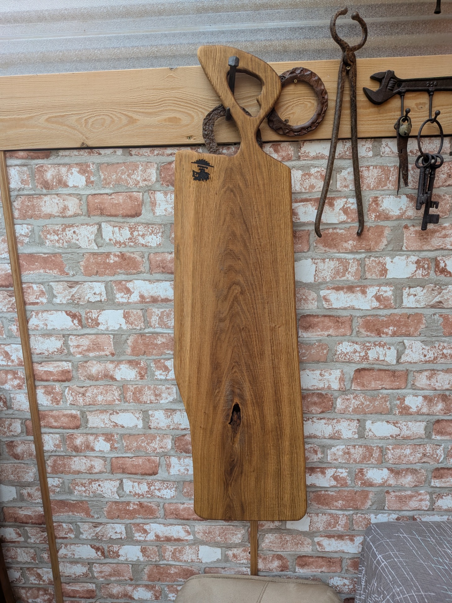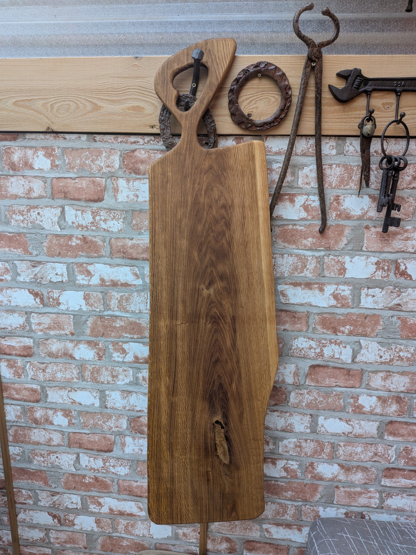 Denko, lopár vyrobené z dubového dreva . Strom mal viac ako 100 rokov , sadil ho manželkin dedko, bohužiaľ bol už chorý tak sme ho museli zrezať , hrozilo zrútenie na rodinný dom. Bolo mi ľúto všetko spáliť v kotly, tak som vyrobil dosky na krájanie, aspoň takto bude ešte niekomu slúžiť. Kazy a trhliny sú zaliate epoxidom. Drevo ošetrené olejom s voskom značky Osmo - bezpečný pri styku s potravinami.